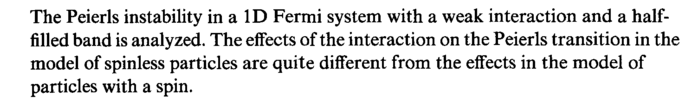 The Peierls instability in a ID Fermi system with a weak interaction and a half-filled band is analyzed. The effects of the interaction on the Peierls transition in the model of spinless particles are quite different from the effects in the model of particles with a spin.