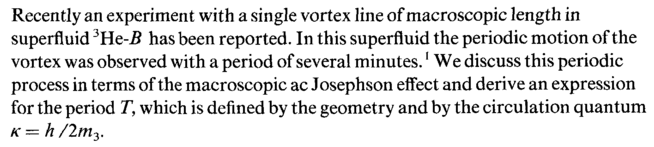 Recently an experiment with a single vortex line of macroscopic length in superfluid 3Hc-B has been reported. In this superfluid the periodic motion of the vortex was observed with a period of several minutes.1 We discuss this periodic process in terms of the macroscopic ac Josephson effect and derive an expression for the period T, which is defined by the geometry and by the circulation quantum к — h /2m3.