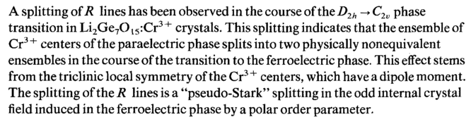 A splitting of R lines has been observed in the course of the D2h -> C2v phase transition in Li2Ge7Ol5:Cr3+ crystals. This splitting indicates that the ensemble of Cr3+ centers of the paraelectric phase splits into two physically nonequivalent ensembles in the course of the transition to the ferroelectric phase. This effect stems from the triclinic local symmetry of the Cr3 + centers, which have a dipole moment. The splitting of the R lines is a "pseudo-Stark" splitting in the odd internal crystal field induced in the ferroelectric phase by a polar order parameter.