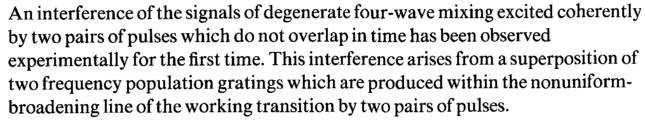 An interference of the signals of degenerate four-wave mixing excited coherently by two pairs of pulses which do not overlap in time has been observed experimentally for the first time. This interference arises from a superposition of two frequency population gratings which are produced within the nonuniform-broadening line of the working transition by two pairs of pulses.
