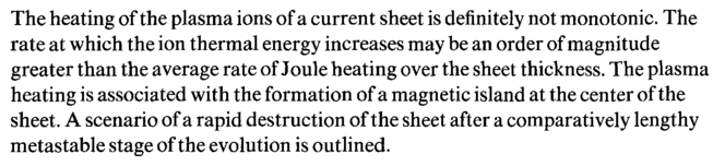 The heating of the plasma ions of a current sheet is definitely not monotonic. The rate at which the ion thermal energy increases may be an order of magnitude greater than the average rate of Joule heating over the sheet thickness. The plasma heating is associated with the formation of a magnetic island at the center of the sheet. A scenario of a rapid destruction of the sheet after a comparatively lengthy metastable stage of the evolution is outlined.
