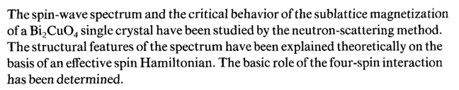 The spin-wave spectrum and the critical behavior of the sublattice magnetization of a Bi2Cu04 single crystal have been studied by the neutron-scattering method. The structural features of the spectrum have been explained theoretically on the basis of an effective spin Hamiltonian. The basic role of the four-spin interaction has been determined.
