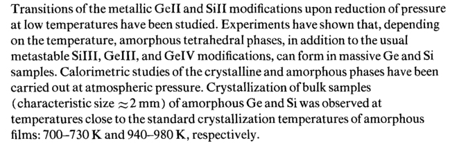 Transitions of the metallic Gell and Sill modifications upon reduction of pressure at low temperatures have been studied. Experiments have shown that, depending on the temperature, amorphous tetrahedral phases, in addition to the usual metastable Silll, GelH, and GelV modifications, can form in massive Ge and Si samples. Calorimetric studies of the crystalline and amorphous phases have been carried out at atmospheric pressure. Crystallization of bulk samples (characteristic size s 2 mm) of amorphous Ge and Si was observed at temperatures close to the standard crystallization temperatures of amorphous films: 700-730 К and 940-980 K, respectively.