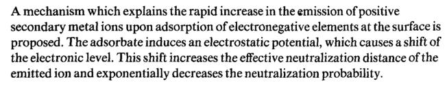 A mechanism which explains the rapid increase in the emission of positive secondary metal ions upon adsorption of electronegative elements at the surface is proposed. The adsorbate induces an electrostatic potential, which causes a shift of the electronic level. This shift increases the effective neutralization distance of the emitted ion and exponentially decreases the neutralization probability.