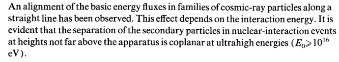 An alignment of the basic energy fluxes in families of cosmic-ray particles along a straight line has been observed. This effect depends on the interaction energy. It is evident that the separation of the secondary particles in nuclear-interaction events at heights not far above the apparatus is coplanar at ultrahigh energies {E0> 1016 eV).