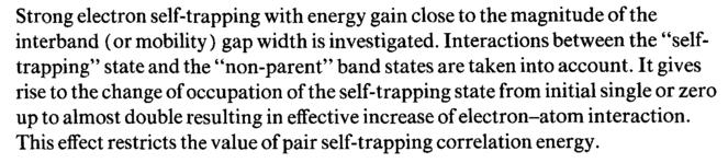 Strong electron self-trapping with energy gain close to the magnitude ofthe interband (or mobility) gap width is investigated. Interactions between the "self-trapping" state and the "non-parent" band states are taken into account. It gives rise to the change of occupation of the self-trapping state from initial single or zero up to almost double resulting in effective increase of electron-atom interaction. This effect restricts the value of pair self-trapping correlation energy.