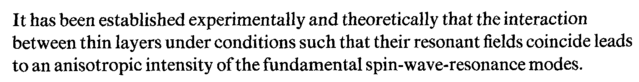 It has been established experimentally and theoretically that the interaction between thin layers under conditions such that their resonant fields coincide leads to an anisotropic intensity of the fundamental spin-wave-resonance modes.