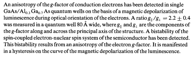 An anisotropy of theg-factor of conduction electrons has been detected in single GaAs/Al0 3 Ga„ 7 As quantum wells on the basis of a magnetic depolarization of luminescence during optical orientation of the electrons. A ratio /g1 = 2.2 + 0.4 was measured in a quantum well 80 A wide, where gy and gx are the components of theg-factor along and across the principal axis of the structure. A bistability of the spin-coupled electron-nuclear spin system of the semiconductor has been detected. This bistability results from an anisotropy of the electron g-factor. It is manifested in a hysteresis on the curve of the magnetic depolarization of the luminescence.