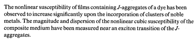 The nonlinear susceptibility of films containing /-aggregates of a dye has been observed to increase significantly upon the incorporation of clusters of noble metals. The magnitude and dispersion of the nonlinear cubic susceptibility of the composite medium have been measured near an exciton transition of the J-aggregates.