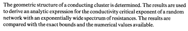 The geometric structure of a conducting cluster is determined. The results are used to derive an analytic expression for the conductivity critical exponent of a random network with an exponentially wide spectrum of resistances. The results are compared with the exact bounds and the numerical values available.
