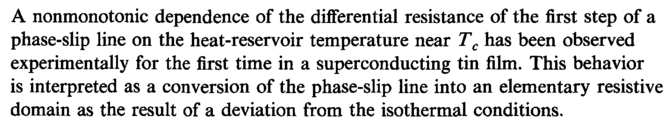 A nonmonotonic dependence of the differential resistance of the first step of a phase-slip line on the heat-reservoir temperature near Tc has been observed experimentally for the first time in a superconducting tin film. This behavior is interpreted as a conversion of the phase-slip line into an elementary resistive domain as the result of a deviation from the isothermal conditions.