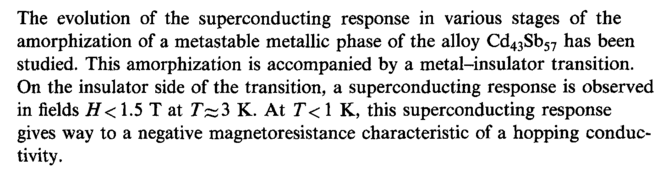 The evolution of the superconducting response in various stages of the amorphization of a metastable metallic phase of the alloy Cd43Sb57 has been studied. This amorphization is accompanied by a metal-insulator transition. On the insulator side of the transition, a superconducting response is observed in fields Η < 1.5 Τ at J~3 К. At T< 1 К, this superconducting response gives way to a negative magnetoresistance characteristic of a hopping conductivity.