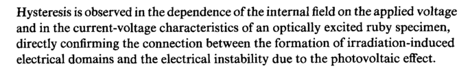 Hysteresis is observed in the dependence of the internal field on the applied voltage and in the current-voltage characteristics of an optically excited ruby specimen, directly confirming the connection between the formation of irradiation-induced electrical domains and the electrical instability due to the photovoltaic effect.
