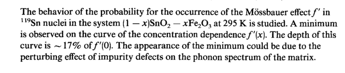The behavior of the probability for the occurrence of the Mossbauer effect/' in U9Sn nuclei in the system (1 — x)Sn02 — *Fe203 at 295 К is studied. A minimum is observed on the curve of the concentration dependence f'(x). The depth of this curve is ~ 17% of/'(0). The appearance of the minimum could be due to the perturbing effect of impurity defects on the phonon spectrum of the matrix.