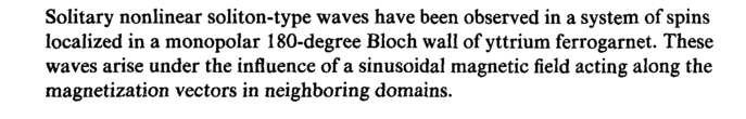 Solitary nonlinear soliton-type waves have been observed in a system of spins localized in a monopolar 180-degree Bloch wall of yttrium ferrogarnet. These waves arise under the influence of a sinusoidal magnetic field acting along the magnetization vectors in neighboring domains.