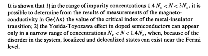 It is shown that 1) in the range of impurity concentrations 1.4 Nc < N < Шс, it is possible to determine from the results of measurements of the magneto-conductivity in Ge(As) the value of the critical index of the metal-insulator transition; 2) the Yosida-Toyozawa effect in doped semiconductors can appear only in a narrow range of concentrations Nc <N< IANC9 when, because of the disorder in the system, localized and delocalized states can exist near the Fermi level.