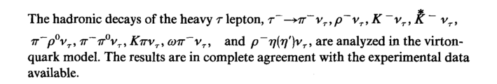 The hadronic decays of the heavy τ lepton, τ -+π vr,p vT,K vTfk vr, π~~ρ°ντ, π~ιτ°ντ, Κπντ, ωπ~ντ, and ρ~η(η')ντ, are analyzed in the virton-quark model. The results are in complete agreement with the experimental data available.