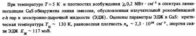 При температуре Г=5 К и плотностях возбуждения £,0,2 МВт · см"2 в спектрах люминесценции GaS обнаружена линия эмиссии, обусловленная излучательной рекомбинацией e-h пар в электронно-дырочной жидкости (ЭДЖ). Оценены параметры ЭДЖ в GaS: критическая температура Тк ~ 130 К, равновесная плотность п9 ~ 2,3 · 102в см-3, энергия связи ЭДЖ Е~ 117 мэВ.