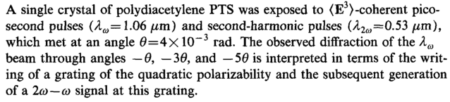 A single crystal of polydiacetylene PTS was exposed to (E3)-coherent picosecond pulses (Λω=1.06 μηι) and second-harmonic pulses (Λ2ω=0.53 μπι), which met at an angle 0=4 X 10"3 rad. The observed diffraction of the λω beam through angles — 0, — 30, and —50 is interpreted in terms of the writing of a grating of the quadratic polarizability and the subsequent generation of a 2ύ>—со signal at this grating.