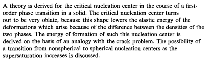 A theory is derived for the critical nucleation center in the course of a first-order phase transition in a solid. The critical nucleation center turns out to be very oblate, because this shape lowers the elastic energy of the deformations which arise because of the difference between the densities of the two phases. The energy of formation of such this nucleation center is derived on the basis of an analogy with the crack problem. The possibility of a transition from nonspherical to spherical nucleation centers as the supersaturation increases is discussed.