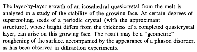 The layer-by-layer growth of an icosahedral quasicrystal from the melt is analyzed in a study of the stability of the growing face. At certain degrees of supercooling, seeds of a periodic crystal (with the approximant structure), whose height differs from the thickness of a completed quasicrystal layer, can arise on this growing face. The result may be a "geometric" roughening of the surface, accompanied by the appearance of a phason disorder, as has been observed in diffraction experiments.