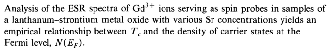 Analysis of the ESR spectra of Gd + ions serving as spin probes in samples of a lanthanum-strontium metal oxide with various Sr concentrations yields an empirical relationship between Tc and the density of carrier states at the Fermi level, N{EF).
