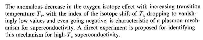 The anomalous decrease in the oxygen isotope effect with increasing transition temperature Tc, with the index of the isotope shift of Tc dropping to vanish-ingly low values and even going negative, is characteristic of a plasmon mechanism for superconductivity. A direct experiment is proposed for identifying this mechanism for high-Γ^ superconductivity.