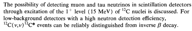 The possibility of detecting muon and tau neutrinos in scintillation detectors through excitation of the 1+ level (15 MeV) of l2C nuclei is discussed. For low-background detectors with a high neutron detection efficiency, 12C(v,v)12C* events can be reliably distinguished from inverse β decay.