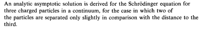 An analytic asymptotic solution is derived for the Schrodinger equation for three charged particles in a continuum, for the case in which two of the particles are separated only slightly in comparison with the distance to the third.