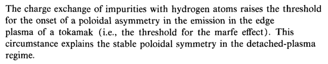 The charge exchange of impurities with hydrogen atoms raises the threshold for the onset of a poloidal asymmetry in the emission in the edge plasma of a tokamak (i.e., the threshold for the marfe effect). This circumstance explains the stable poloidal symmetry in the detached-plasma regime.