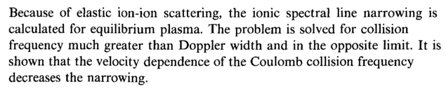 Because of elastic ion-ion scattering, the ionic spectral line narrowing is calculated for equilibrium plasma. The problem is solved for collision frequency much greater than Doppler width and in the opposite limit. It is shown that the velocity dependence of the Coulomb collision frequency decreases the narrowing.