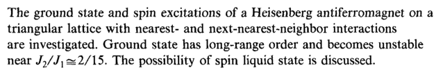The ground state and spin excitations of a Heisenberg antiferromagnet on a triangular lattice with nearestand next-nearest-neighbor interactions are investigated. Ground state has long-range order and becomes unstable near /2/·Λ=2/15. The possibility of spin liquid state is discussed.