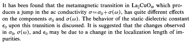 It has been found that the metamagnetic transition in La2Cu04, which produces a jump in the ac conductivity σ=σ0 + σ(ω), has quite different effects on the components σ0 and σ(ω). The behavior of the static dielectric constant e0 upon this transition is discussed. It is suggested that the changes observed in σ0, σ(ω), and e0 may be due to a change in the localization length of impurities.