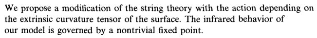 We propose a modification of the string theory with the action depending on the extrinsic curvature tensor of the surface. The infrared behavior of our model is governed by a nontrivial fixed point.
