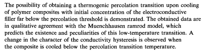 The possibility of obtaining a thermogenic percolation transition upon cooling of polymer composites with initial concentration of the electroconductive filler far below the percolation threshold is demonstrated. The obtained data are in qualitative agreement with the Muenchhausen ramrod model, which predicts the existence and peculiarities of this low-temperature transition. A change in the character of the conductivity hysteresis is observed when the composite is cooled below the percolation transition temperature.