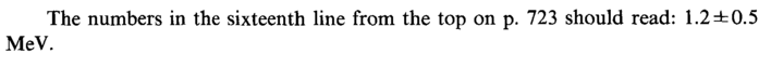 The numbers in the sixteenth line from the top on p. 723 should read: 1.2±0.5 MeV.