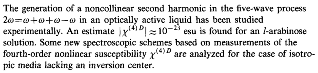 The generation of a noncollinear second harmonic in the five-wave process 2ω = ω+ω + ω — ω in an optically active liquid has been studied experimentally. An estimate |^(4ii>| slO-23 esu is found for an /-arabinose solution. Some new spectroscopic schemes based on measurements of the fourth-order nonlinear susceptibility xw D are analyzed for the case of isotropic media lacking an inversion center.