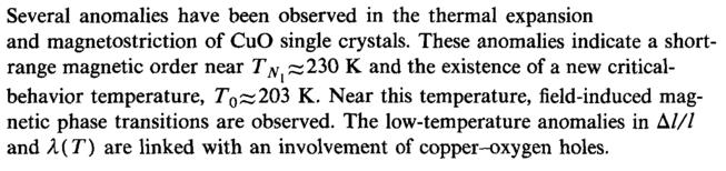 Several anomalies have been observed in the thermal expansion and magnetostriction of CuO single crystals. These anomalies indicate a short-range magnetic order near TN^ sr230 К and the existence of a new critical-behavior temperature, Г0^203 К. Near this temperature, field-induced magnetic phase transitions are observed. The low-temperature anomalies in ΔΙ/1 and λ{Τ) are linked with an involvement of copper-oxygen holes.