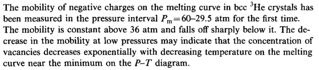 The mobility of negative charges on the melting curve in bcc 3He crystals has been measured in the pressure interval Pm = 60-29.5 atm for the first time. The mobility is constant above 36 atm and falls off sharply below it. The decrease in the mobility at low pressures may indicate that the concentration of vacancies decreases exponentially with decreasing temperature on the melting curve near the minimum on the P-T diagram.