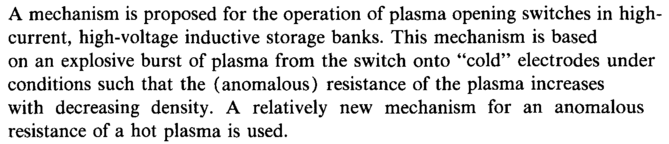 A mechanism is proposed for the operation of plasma opening switches in high-current, high-voltage inductive storage banks. This mechanism is based on an explosive burst of plasma from the switch onto "cold" electrodes under conditions such that the (anomalous) resistance of the plasma increases with decreasing density. A relatively new mechanism for an anomalous resistance of a hot plasma is used.