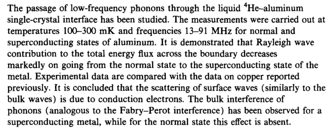 The passage of low-frequency phonons through the liquid 4He~aluminum single-crystal interface has been studied. The measurements were carried out at temperatures 100-300 mK and frequencies 13-91 MHz for normal and superconducting states of aluminum. It is demonstrated that Rayleigh wave contribution to the total energy flux across the boundary decreases markedly on going from the normal state to the superconducting state of the metal. Experimental data are compared with the data on copper reported previously. It is concluded that the scattering of surface waves (similarly to the bulk waves) is due to conduction electrons. The bulk interference of phonons (analogous to the Fabry-Perot interference) has been observed for a superconducting metal, while for the normal state this effect is absent.