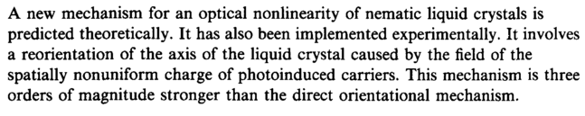 A new mechanism for an optical nonlinearity of nematic liquid crystals is predicted theoretically. It has also been implemented experimentally. It involves a reorientation of the axis of the liquid crystal caused by the field of the spatially nonuniform charge of photoinduced carriers. This mechanism is three orders of magnitude stronger than the direct orientational mechanism.