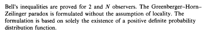 Bell's inequalities are proved for 2 and N observers. The Greenberger-Horn-Zeilinger paradox is formulated without the assumption of locality. The formulation is based on solely the existence of a positive definite probability distribution function.