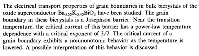 The electrical transport properties of grain boundaries in bulk bicrystals of the oxide superconductor Bao 55K0 45Bi03 have been studied. The grain boundary in these bicrystals is a Josephson barrier. Near the transition temperature, the critical current of this barrier has a power-law temperature dependence with a critical exponent of 3/2. The critical current of a grain boundary exhibits a nonmonotonic behavior as the temperature is lowered. A possible interpretation of this behavior is discussed.