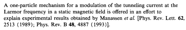 A one-particle mechanism for a modulation of the tunneling current at the Larmor frequency in a static magnetic field is offered in an effort to explain experimental results obtained by Manassen et al [Phys. Rev. Lett. 62, 2513 (1989); Phys. Rev. В 48, 4887 (1993)].