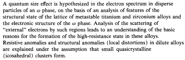 A quantum size effect is hypothesized in the electron spectrum in disperse particles of an ω phase, on the basis of an analysis of features of the structural state of the lattice of metastable titanium and zirconium alloys and the electronic structure of the ω phase. Analysis of the scattering of "external" electrons by such regions leads to an understanding of the basic reasons for the formation of the high-resistance state in these alloys. Resistive anomalies and structural anomalies (local distortions) in dilute alloys are explained under the assumption that small quasicrystalline (icosahedral) clusters form.