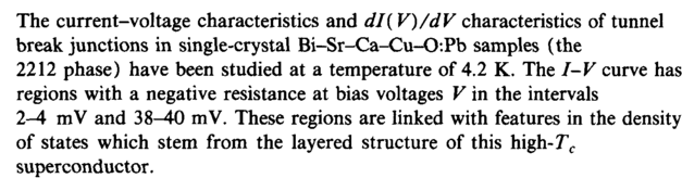 The current-voltage characteristics and dl{ V)/dV characteristics of tunnel break junctions in single-crystal Bi-Sr-Ca-Cu-O-.Pb samples (the 2212 phase) have been studied at a temperature of 4.2 K. The I-V curve has regions with a negative resistance at bias voltages V in the intervals 2-4 mV and 38-40 mV. These regions are linked with features in the density of states which stem from the layered structure of this high-rc superconductor.