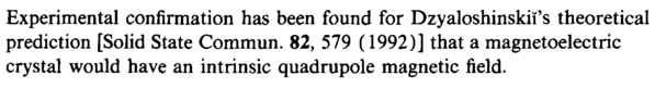 Experimental confirmation has been found for Dzyaloshinskil's theoretical prediction [Solid State Commun. 82, 579 (1992)] that a magnetoelectric crystal would have an intrinsic quadrupole magnetic field.