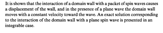 It is shown that the interaction of a domain wall with a packet of spin waves causes a displacement of the wall, and in the presence of a plane wave the domain wall moves with a constant velocity toward the wave. An exact solution corresponding to the interaction of the domain wall with a plane spin wave is presented in an integrable case.
