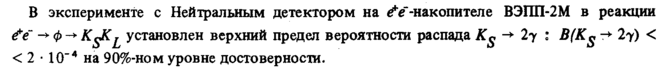 В эксперименте с Нейтральным детектором на 6?V-накопителе ВЭШ1-2М в реакции £е φ -* Установлен верхний предел вероятности распада Kg -*■ 2у : В (Kg ·+ 2у) < < 2 · 10"4 на 90%-ном уровне достоверности.